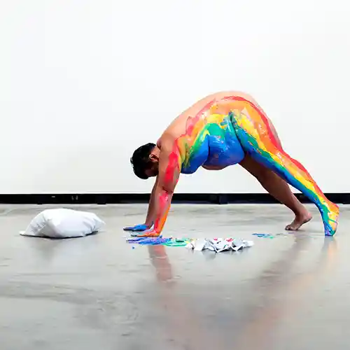 "In der Performance wird der Körper von Naufus Ramírez-Figueroa zum künstlerischen Ausdrucksmittel. Zu Beginn zitiert er ein Gedicht des lateinamerikanischen Poeten Carlos Pellicer. Es handelt von den Schwierigkeiten als sozialistisch gesinnte Person in einem tropischen Land zu leben, weil die schönen Farben die sozialen Missstände der Gesellschaft sofort vergessen lassen. Anschließend bemalt er seine Haut mit Regenbogenfarben, begibt sich selbst in die Haltung eines Bogens, um dessen bunten Abdruck schließlich auf der Wand des Ausstellungsraums zu hinterlassen. „Ich wollte versuchen diese naive Positivität zu erleben, die ich als Kind gefühlt habe, wenn ich Leute über Veränderung habe sprechen hören.“